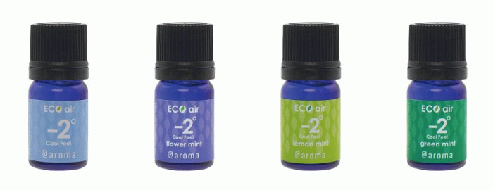 「ECO air Cool Feel」は、体感温度に影響を及ぼすとされるペパーミント、スペアミントなどの天然成分を含む、清涼感のある体感的に涼しさをもたらすオリジナルブレンドの香りです。夏場の暑さ対策として使用することで、エアコンの設定温度を上げても、アロマの成分が感覚に与える清涼感により、快適性が得られ節電にもつながります。また、空気環境改善の効果、暑さからくるイライラなどの気持ちの乱れを整える効果、熱中症軽減にも効果が期待できます。