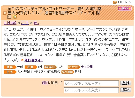『スピリチュアル/精神世界/ニューエイジの総合ポータルメールマガジン』でもありますが、このメルマガは配信者だけではなく読者様みんなで語り合う空間です。大切なのは愛と光と心の共有です。スピリチュアルは物質世界をより良く生きるための知恵です。【運営元について】非営利型法人、理事会は全員無報酬。癒し&スピリチュアル分野を世界的文化に高め、それによる国内&国際的な慈善活動・人道活動を行う。ライトワークで生きられる革命的な世界初のインストラクター事業を行う。合言葉は『ひとりじゃない、心配すんな、大丈夫だ』