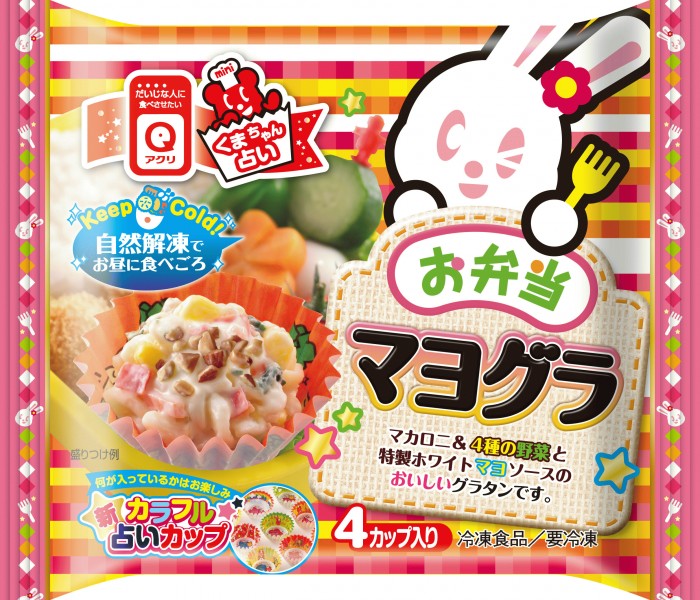 カラフルくまちゃん占いで、楽しいお弁当を! アクリフーズ 冷凍惣菜 「くまちゃん占いシリーズ」 新商品のご案内 グラタンはお弁当に人気のおかずメニューの1つですが、今季はこれからの季節に便利で安心な、自然解凍でもおいしく食べられるホワイトマヨソース仕立てのマカロニグラタン『お弁当マヨグラ』を発売いたします。