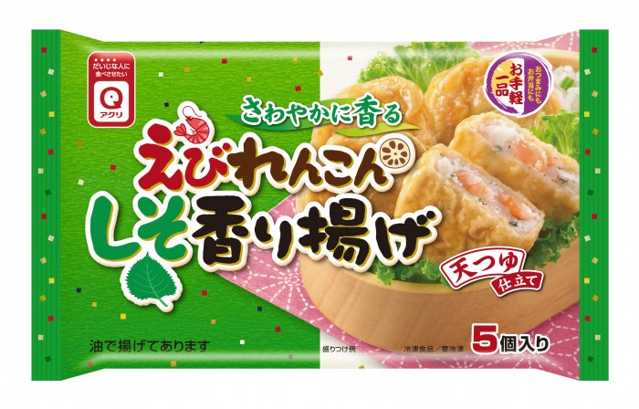 青しそ、えび、れんこん入りのすり身をふんわり揚げた天つゆがけのおかずです。