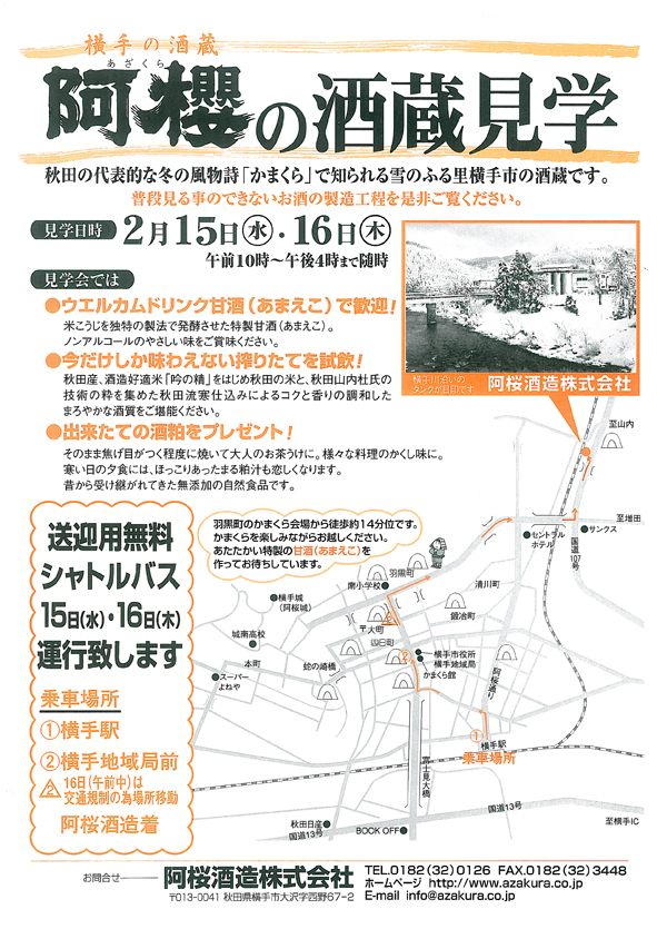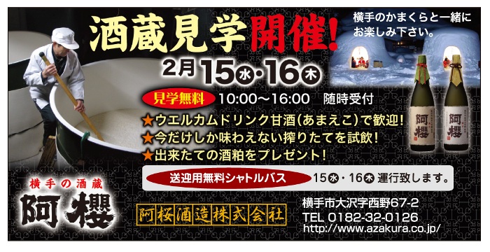 かまくらのまち、秋田県横手市の酒蔵、阿櫻酒造が 【かまくら祭り】 に合わせて 【蔵開放】 を開催。普段味わえない出来立ての酒粕で作った甘酒や、搾りたて新酒の無料試飲などを行います。 阿櫻酒造株式会社(代表取締役 田中文悟 本社 秋田県横手市)は平成24年2月15日(水)、16日(木)に開催される横手市の伝統行事、かまくら祭りに合わせて蔵開放を行います。